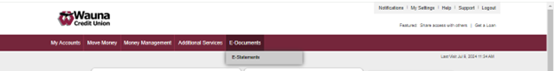 2. Navigate to the E-Documents tab on web. If you are using the mobile app, navigate to the More button. Navigate to the Account Services section and click on E-Statements.